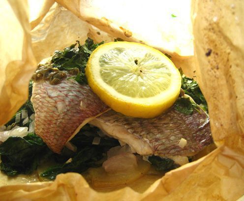 Προθερμαίνετε το φούρνο στους 200 C (αντίσταση πάνω κάτω και αέρα αν έχετε). Σοτάρετε τα φύλλα των χορταρικών σε λίγο ελαιόλαδο αλατίζετε και τα βάζετε στην άκρη. Αν χρησιμοποιήσετε σπανάκι, τρίψτε λίγο μοσχοκάρυδο από πάνω. Εξουδετερώνει την στιφή του αίσθηση. (tip Δρισκα πολύ χρησιμο) Τηγανίζετε τις λεπτές ροδέλες πατάτας Μέχρι να μαλακώσουν, αλλά όχι απαραίτητα να πάρουν χρώμα. Κόβετε 2 μεγάλα φύλλα λαδόκολας (ή και αλουμινόχαρτο, αλλά θα γίνει λίγο πιο “ξερό”). Σε κάθε λαδόκολλα τοποθετείτε ένα στρώμα πατάτες, ένα στρώμα χορταρικά, λίγο κρεμμύδι και σκόρδο, τα δύο φιλέτα σε σχήμα χιαστί, την κάππαρη, το μαϊντανό, περιχύνετε με λίγο ελαιόλαδο και μια κουτ. γλυκού λευκό κρασί. Από πάνω από τον πύργο που έχετε φτιάξει βάζετε μια ροδέλα λεμόνι. Κλείνετε καλά τα πακέτα (για να δείτε πώς γίνεται πηγαίνετε εδώ). Ψήνετε για 15-20 λεπτά, ανάλογα με το πάχος του ψαριού. Ανοίγετε και απολαμβάνετε!