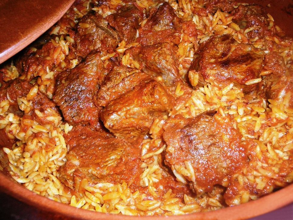 ελαιόλαδο 1 ½ κιλού μοσχαράκι κομμένο σε 16 κομμάτια. Νουά σπάλας (σπαλομίτα), κιλότο, στρογγυλό, κότσι ή ποντίκι, σβέρκος ή ελιά ελαιόλαδο 2 μέτρια κρεμμύδια όχι εντελώς πολτοποιημένα, 4 σκελίδες σκόρδου όχι έντελώς πολτοποιημένες (να βρίσκουμε στο δόντι) 1 κούπα κόκκινο κρασί 800 γρ. φρέσκες ώριμες ντομάτες (4 μέτριες = 3 κούπες), ξεφλουδισμένες και ξεσποριασμένες, σε κομματάκια (για ατόφια τη γεύση των υλικών), με 1 κουταλάκι ζάχαρη και λίγο ντοματοπολτό (ο ντοματοπολτός προσθέτει γλύκα, συνοχή και χρώμα) ή και κονσέρβας αποφλοιωμένες σε κομματάκια, 800 γρ. (2 κονσέρβες = 3 κούπες) αλάτι, πιπέρι φρεσκοαλεσμένο κανέλα, μπαχάρι ½ κιλού κριθαράκι ½ κούπας μαργαρίνη 6 κούπες νερό ζεστό κεφαλοτύρι