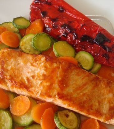 500 γρ σολομό φιλέτο 2-3 κολοκυθάκια, κομμένα λεπτές φέτες 2-3 καρότα, κομμένα λεπτές φέτες Μερικά μανιτάρια στρογγυλά 2 μέτριες πιπεριές Φλωρίνης