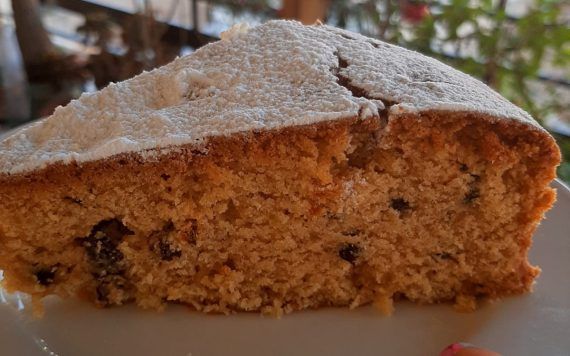 Προσθέτουμε το μείγμα με την μαγειρική σόδα στο μείγμα με την ζάχαρη και ανακατεύουμε. Στο τέλος βάζουμε την κανέλα, το γαρίφαλο, το αλεύρι για όλες τις χρήσεις και το μπέικιν πάουντερ. Μεταφέρουμε το μείγμα στο ταψί. Αλευρώνουμε τις σταφίδες και τις προσθέτουμε στο μείγμα αφού το έχουμε στρώσει ήδη στο ταψί. Ψήνουμε για 1 ώρα, στους 180 βαθμούς Κελσίου, στις αντιστάσεις. Σας άρεσε αυτή η συνταγή; Πείτε μας την γνώμη σας στα σχόλια.
