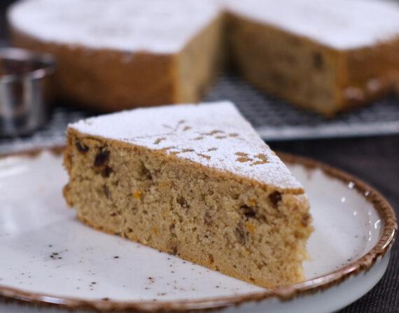 400 g self raising flour 250 g orange juice+Zest from 1 orange 250 g sugar 200 g olive oil 1 tsp cinnamon powder 70 g raisins+1 tbsp self raising flour 80 g walnuts ,grated ——————————————————————– olive oil+flour ——————————————————————- Powdered sugar ——————————————————————- 26 cm