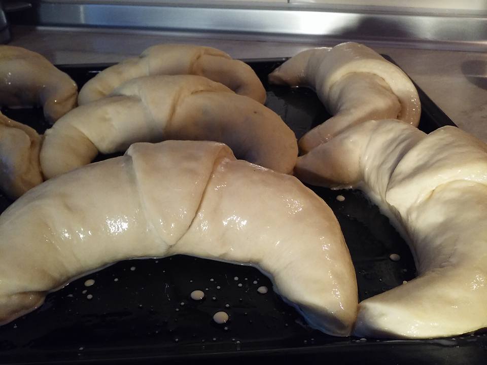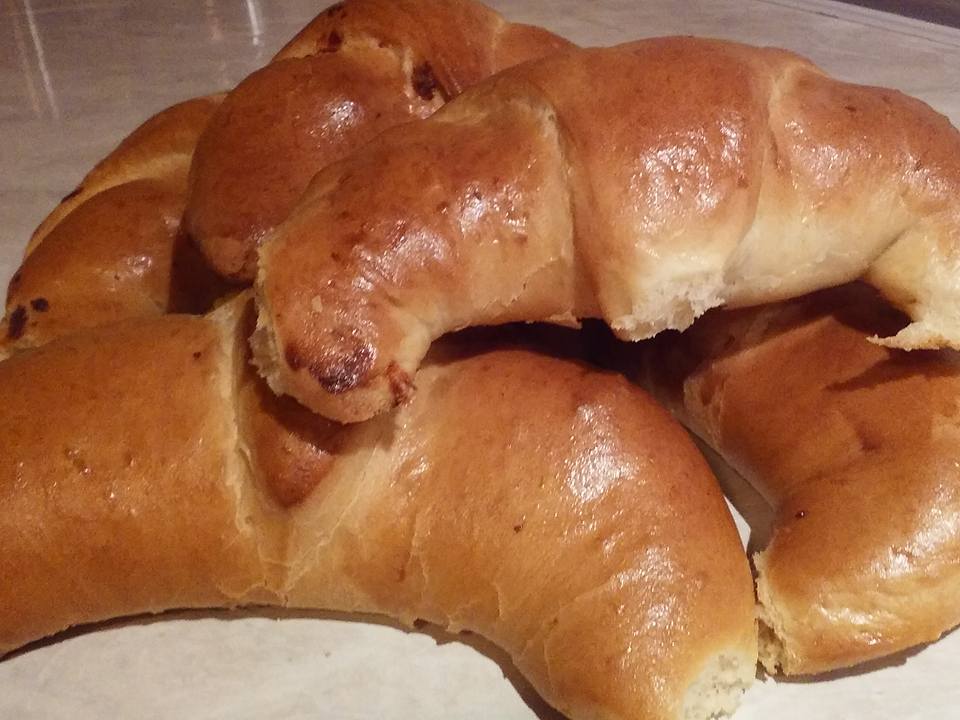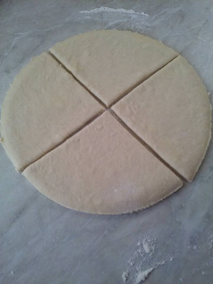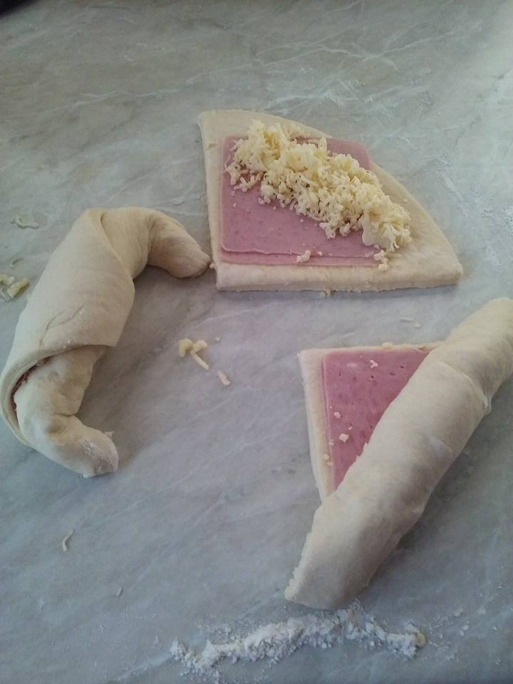 ΚΡΟΥΑΣΑΝ ΖΑΜΠΟΝ-ΤΥΡΙ! ___________________________ ΥΛΙΚΑ: Ζύμη: 550ml.χλιαρό νερό 1100γρ. αλευρι για όλες τής χρήσεις 200γρ.βούτυρο παγωμένο σε κυβάκια 2κουταλιές τής σούπας ζάχαρη 1κουταλάκι του γλυκού αλάτι 1σφηνάκι γάλα εβαπορέ 2φακελάκια ξερή μαγιά (Ίσως χρειαστεί λίγο αλεύρι ακόμη,θα δείξει το ζύμωμα) Γέμιση: 400γρ παριζα,η ζαμπόν 300γρ τυρί κίτρινο τριμμένο ΤΡΟΠΟΣ ΠΑΡΑΣΚΕΥΗΣ ________________________ Σε μία λεκάνη ρίχνουμε όλα μαζί τα υλικά εκτός από το αλεύρι.Ανακατεύουμε ελαφρά και μόλις ξεκινά να λιώνει το βούτυρο στο μείγμα,προσθέτουμε σιγά σιγά το κοσκινησμενο αλεύρι και ζυμώνουμε μέχρι να φτιάξουμε ένα εύπλαστο μαλακό ζυμάρι.Το αφήνουμε να φουσκώσει για 40 λεπτά,ξεφουσκωνουμε το ζυμάρι και ανοίγουμε φύλλα πάχους ενός εκατοστού τοποθετώντας ένα μεγάλο πιάτο για να κόψουμε περιμετρικά ένα δίσκο.Κόβουμε σε σταυρό και βάζουμε ζαμπόν και τυρί.Με ένα πινέλο βρεχουμε τις άκρες και τυλίγουμε από έξω προς τα μέσα.Τα αφήνουμε να φουσκώσουν για μία ώρα ,αλείφουμε με γάλα και ψήνουμε στους 170βαθμούς για περίπου 35-40λεπτά σε προθερμασμένο φούρνο στον αέρα. Καλή σάς επιτυχία!