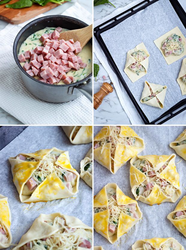 Αλατοπιπερώνετε το μείγμα, πασπαλίζετε (προαιρετικά) με λίγο μοσχοκάρυδο, ρίχνετε μέσα και το σπανάκι και συνεχίζετε το σιγοβράσιμο, ανακατεύοντας, για 1 λ. Προσθέτετε και τα κομματάκια ζαμπόν και το 1 φλιτζάνι τριμμένο τυρί, ανακατεύετε και κατεβάζετε τη κατσαρόλα από τη φωτιά. Στρώνετε με χαρτί ψησίματος το ταψί του φούρνου και τοποθετείτε τα 8 τετράγωνα κομμάτια σφολιάτας. Ρίχνετε στο κέντρο κάθε σφολιάτας τη γέμιση, ισομερώς μοιρασμένη στα 8, τα πασπαλίζετε από πάνω με το υπόλοιπο 1/3 φλ. τυρί τριμμένο και κλείνετε τη ζύμη σαν “τσέπες”