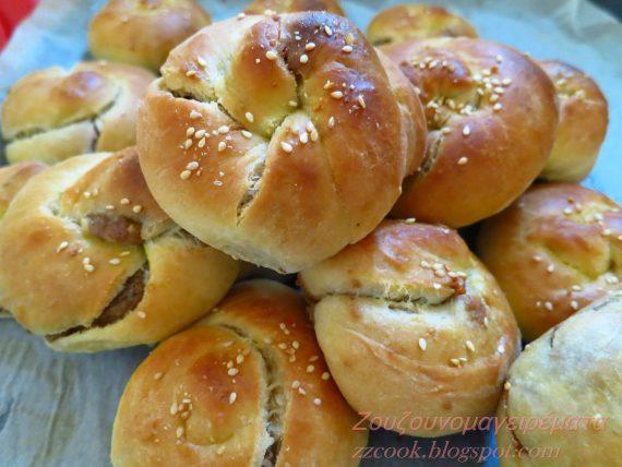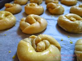 Αφήνουμε 30 λεπτά να φουσκώσουν, τα περνάμε με ένα κρόκο αυγού αραιωμένο με λίγο νερό.