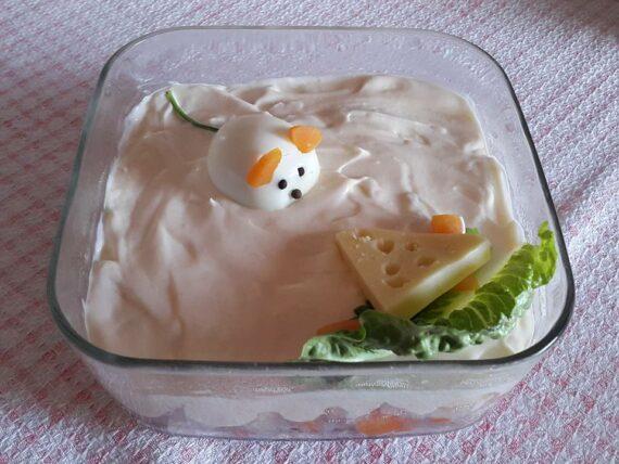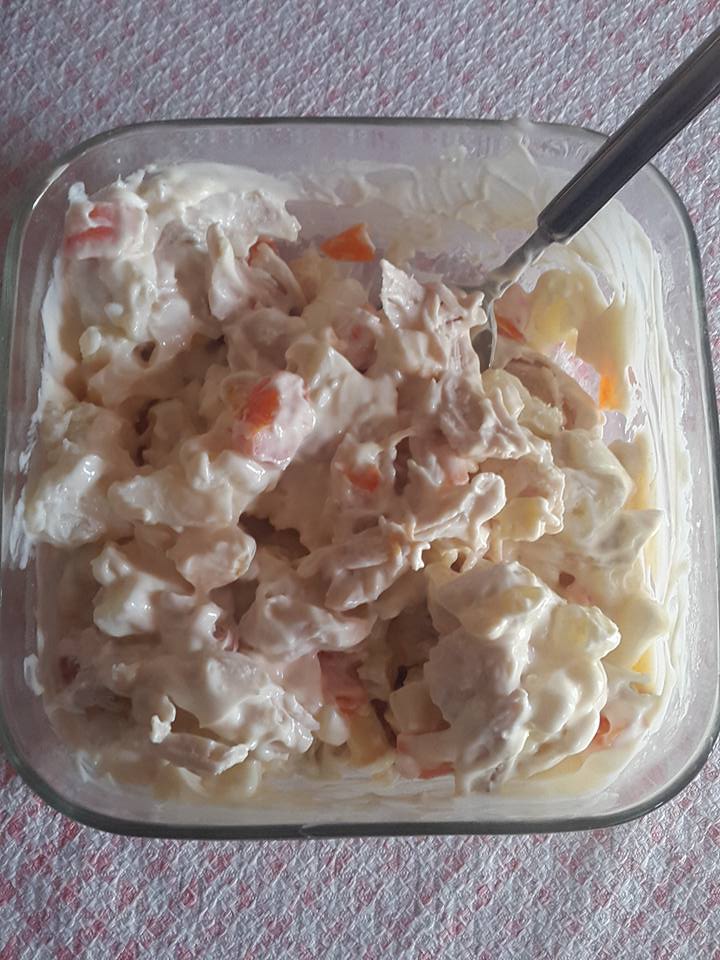Κοτοσαλάτα Υλικά •2 μέτρια σε μέγεθος στήθη κοτόπουλου •2 αυγά •2 πατάτες •2 καρότα •½ κιλό τυρί γκούντα •1 βαζάκι (μεγάλο) μαγιονέζα •1 κουτ.σούπας μουστάρδα •1 κουτ.γλυκού κετσαπ •πιπέρι (προεραιτικά) Εκτέλεση Βράζουμε το κοτόπουλο,τα αυγά,τις πατάτες και τα καρότα. Κόβουμε σε μικρά κυβάκια ολα τα υλικά μας.Τα κόβουμε όσο πιο μικρά μπορούμε. Βάζουμε όλα τα υλικά σε ένα μεγάλο μπολ,προσθέτουμε τη μαγιονέζα,τη μουστάρδα,τη κετσαπ,αν θέλουμε λίγο πιπέρι και ανακατεύουμε καλά. Βάζουμε τη σαλάτα στο ψυγείο για τουλάχιστον 2 ώρες και τη σερβίρουμε.