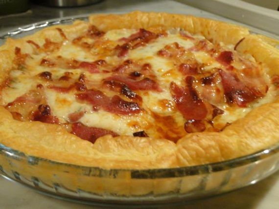 6. Απλώνετε τη μισή γέμιση πάνω στη βάση και στρώνετε τη μισή ποσότητα μπέικον. Στη συνέχεια απλώνετε την υπόλοιπη γέμιση και ισιώνετε την επιφάνεια με την ανάποδη ενός κουταλιού. Στρώνετε το υπόλοιπο μπέικον και πασπαλίζετε την επιφάνεια με λίγο πιπέρι. 7. Ψήνετε την πίτα σε προθερμασμένο φούρνο στους 180C, για 40 με 45 λεπτά, μέχρι να ροδίσει. Την αφήνετε λίγο να σταθεί και σερβίρετε.