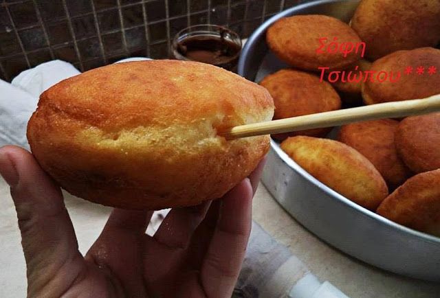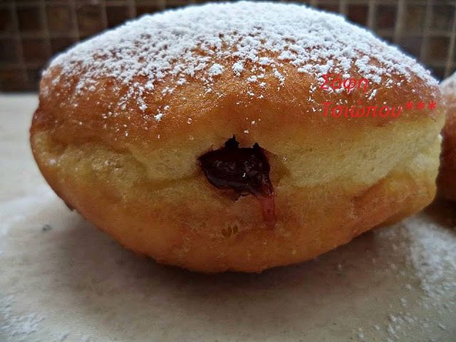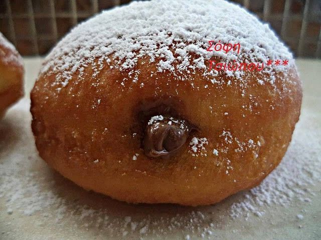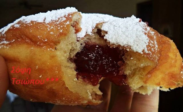 ΥΛΙΚΑ 5 κουπες αλευρι για ολες τις χρησεις 1 φακελακι μαγια 1 κοφτό κουταλακι του γλυκου αλατι 1/3 της κουπας ζαχαρη 1/4 κουπας σπορελαιο 1/4 κουπας βηταμ λιωμενο(ή βαζουμε μονο σπορελαιο ή μονο βηταμ) 2 αυγα 11/2 κουπα γαλα χλιαρο Νουτελα ή μαρμελαδα για το γεμισμα αχνη για το πασπαλισμα σπορελαιο για το τηγανισμα ΕΚΤΕΛΕΣΗ Σε ενα μπολ βαζω το ζεστο γαλα,τη μαγια και 1 κ.γ απο τη ζαχαρη,ανακατευω και το αφηνω στην ακρη μεχρι να ετοιμασω τα υπολοιπα.Στον καδο του μιξερ ριχνω τα αυγα,την υπολοιπη ζαχαρη,το αλατι,το λαδι και το βηταμ και απλα τα χτυπαω ισα να ανακατευτουν.Προσθετω το γαλα με τη μαγια που στο διαστημα αυτο εχει ενεργοποιηθει,και ολο το αλευρι(εγω κρατησα λιγο αλλα τελικα το πηρε ολο) και ζυμωνω στο μιξερ 3-4 λεπτα.Αν δεν εχω μιξερ κανενα προβλημα το ζυμωνω με τα χερια.Αφηνω τη ζυμη να φουσκωσει 1 ωρα σκεπασμενη,(αλλα εγώ την εβαλα σκεπασμενη στο ψυγειο ολο το βραδυ και το πρωι ηταν ”τουμπανο”) και μετα τη χωριζω σε 2 μερη,ανοιγω χοντρο φυλλο παχους 1 1/2 εκατοστο,κοβω με κουπατ ή ένα ποτηρι κυκλους,τους βαζω σε αλευρωμενη λαδοκολα και αφηνω να ξαναφουσκωσουν 20-30 λεπτα.Τηγανιζω σε σπορελαιο,(ΠΡΟΣΟΧΗ ΟΧΙ ΠΟΛΥ ΚΑΥΤΟ ΤΟ ΛΑΔΙ ΓΙΑ ΝΑ ΨΗΘΟΥΝ ΚΑΙ ΑΠΟ ΜΕΣΑ)τα αφηνω σε πιατελα με χαρτι κουζινας (ΟΧΙ ΤΟ ΕΝΑ ΠΑΝΩ ΣΤΟ ΑΛΛΟ) και μετα με ενα ξυλακι η μαχαιρι τα τρυπαω (ΔΕΙΤΕ ΦΩΤΟ) και τα γεμιζω με κορνε νουτελα η μαρμελαδα.Τα πασπαλιζω με αχνη η κρυσταλικη ζαχαρη!!!!!!