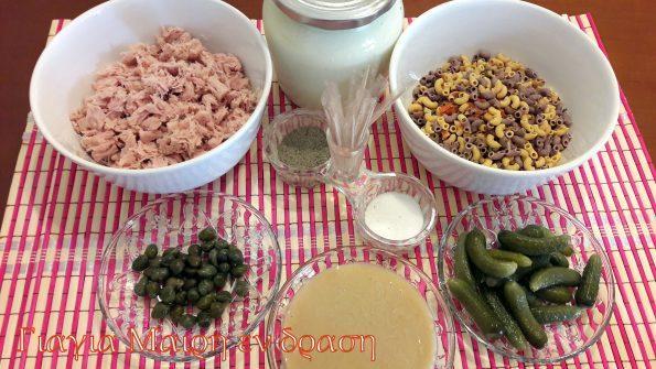 Υλικά 250 γραμ τόνο σε νερό 200 γραμ μακαροτσίνια η’ ότι άλλο ζυμαρικό σας αρέσει 1 κσ ταχίνι 1 κσ κάπαρη 1 κσ ψιλοκομμένο αγγουράκι τουρσί 250 γραμ μαγιονέζα αλατοπίπερο