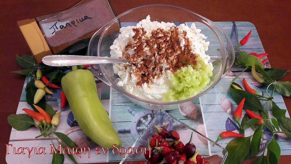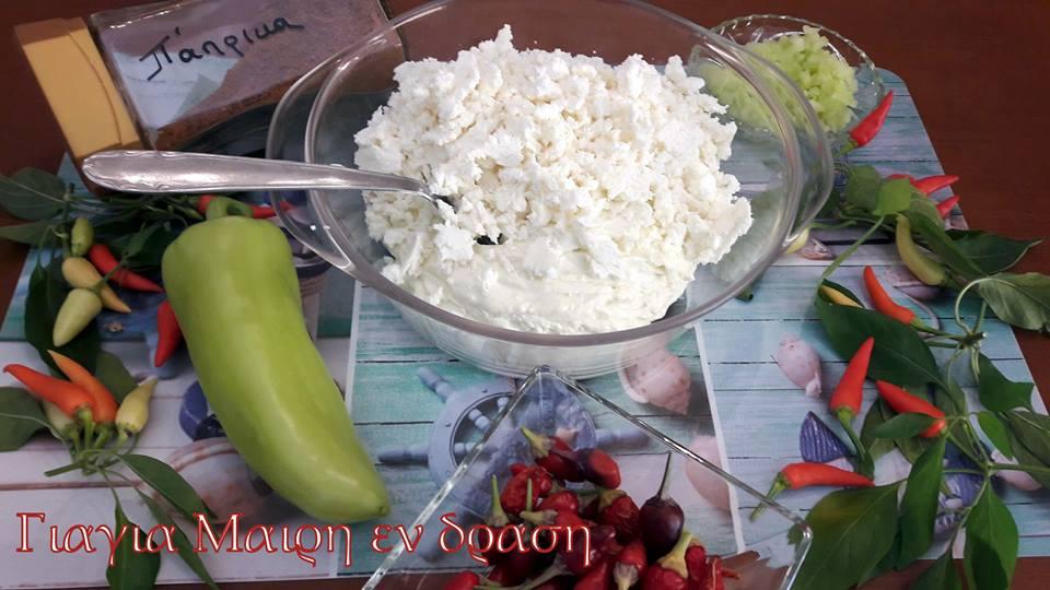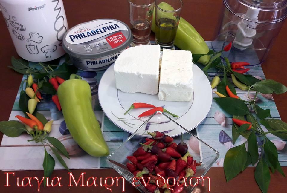 300 γραμ φέτα 1 Φιλαδέλφεια 150 γραμ ανθότυρο 1 πιπεριά πράσινη κέρατο 3 κόκκινες καυτερές πιπερίτσες 2 κσ ξύδι 1 κσ πάπρικα 4 κσ ελαιόλαδο