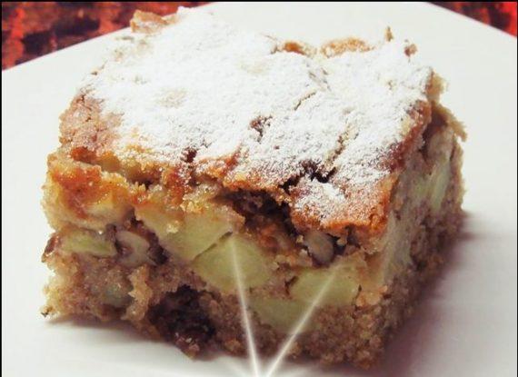 Υλικά : 2 φλιτζάνια αλεύρι που φουσκώνει μόνο του 2 κουταλάκια του γλυκού μπέικιν παουντερ 1 φλιτζάνι τσαγιού βούτυρο 1,1/2 φλιτζάνι ζάχαρη 1 φλιτζάνι καρύδι χοντροκομμενο 3 αυγά 3 Μεγάλα μήλα σε κύβους 3/4 φλιτζανιού γάλα 1 κουταλάκι του γλυκού κανέλα 1/2 κουταλάκι του γλυκού γαρύφαλλο.