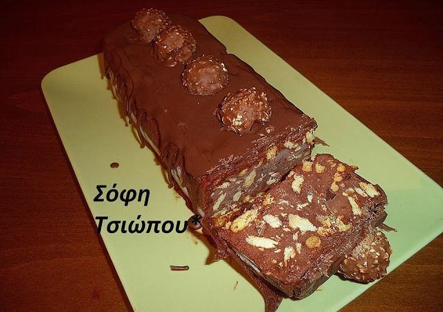 Φανταστικό μωσαϊκό με merenda από τη Σοφη Τσιώπου Κορμός με 3 υλικά της φίλης μου Maria Ntelimara!!! Εγώ πρόσθεσα σοκοφρετες και σοκολατάκια Φερέρο Ροσσέ. Ετσι έφτιαξα τον κορμό του ”Πρέσβη”!!! ΚΟΡΜΟΣ ΤΟΥ ”ΠΡΕΣΒΗ” ΥΛΙΚΑ 250 γρ.κρέμα γάλακτος(κρύα από το ψυγείο) 1 βαζάκι(400 γρ.)μερέντα 1 και μισό πακέτο μπισκότα πτι-μπερ σπασμένα σε κομματάκια 3 σοκοφρέτες θρυμματισμένες σοκολατάκια Φερέρο για το στόλισμα ΕΚΤΕΛΕΣΗ Χτυπάω την κρέμα γάλακτος να αφρατέψει λίγο και προσθέτω τη μερέντα λιωμένη.Ρίχνω και ανακατεύω τα μπισκότα και τις σοκοφρέτες και αδειάζω το μίγμα σε μακρόστενη φόρμα για κέικ στρωμένη με μεμβράνη.Βάζω στην κατάψυξη να παγώσει 3-4 ωρίτσες,ξεφορμάρω και γαρνίρω με μερέντα ή λιωμένη σοκολάτα γάλακτος.Κόβω στη μέση μερικά σοκολατάκια Φερέρο και στολίζω την επιφάνεια!