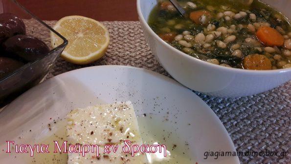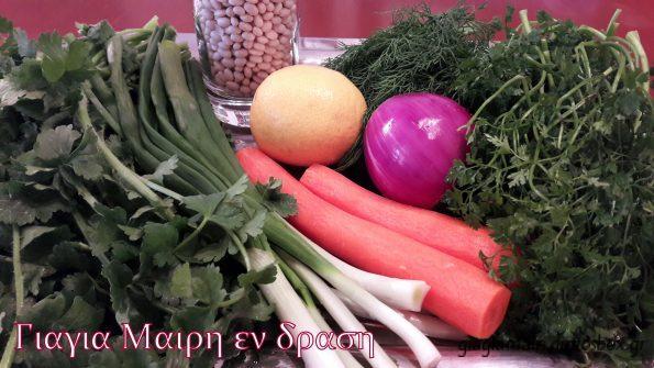 Αν αγαπάτε τα όσπρια αξίζει να την δοκιμάσετε! 1 ποτήρι φασόλια 2 καρότα σε ροδέλες μια χούφτα άνηθο ψιλοκομμένο μια χούφτα κρεμμυδάκια ψιλοκομμένα μια χούφτα μυρώνια ψιλοκομμένα μια χούφτα καυκαλήθρες ψιλοκομμένα 2-3 κλαράκια σέλινο ψιλοκομμένο 1 μεγάλο κρεμμύδι χοντροκομμένο 1 ποτηράκι του κρασιού ελαιόλαδο 1 λεμόνι μπόλικο αλατοπίπερο