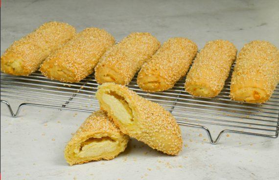 Στην μία πλευρά τοποθετούμε αρκετή γέμιση. Την άλλη την αλείφουμε με τον κρόκο που κρατήσαμε. Τυλίγουμε σε ρολό και κλείνουμε καλά. Κόβουμε τις άκρες και περνάμε τις φλογέρες μας από βρεγμένο σουσάμι. Τις τοποθετούμε σε ταψί με αντικολλητικό χαρτί και ψήνουμε στους 180 βαθμούς μέχρι να ροδίσουν.