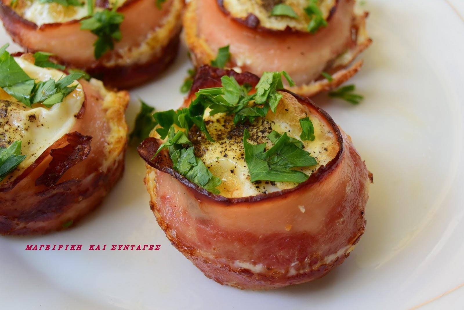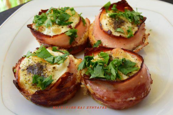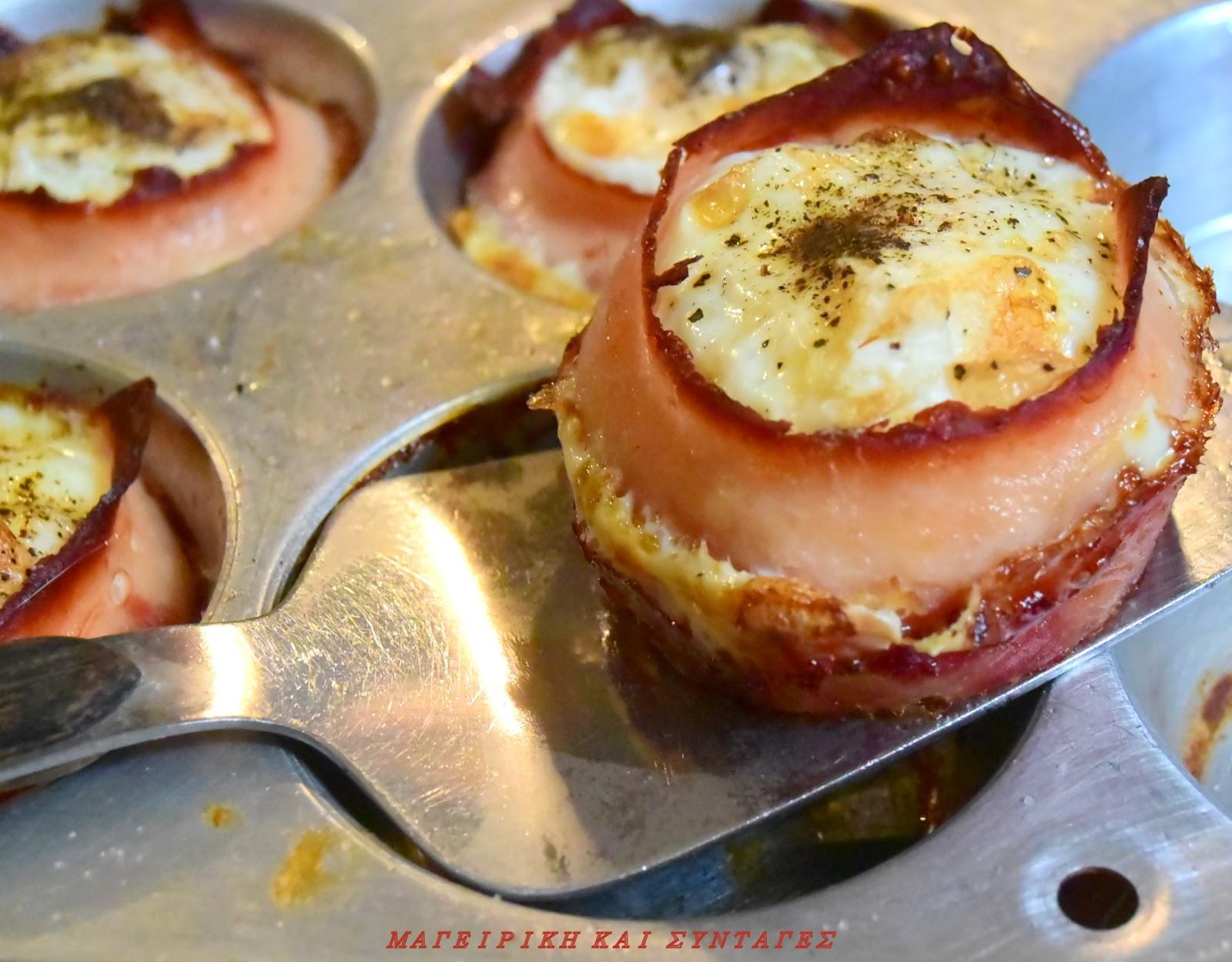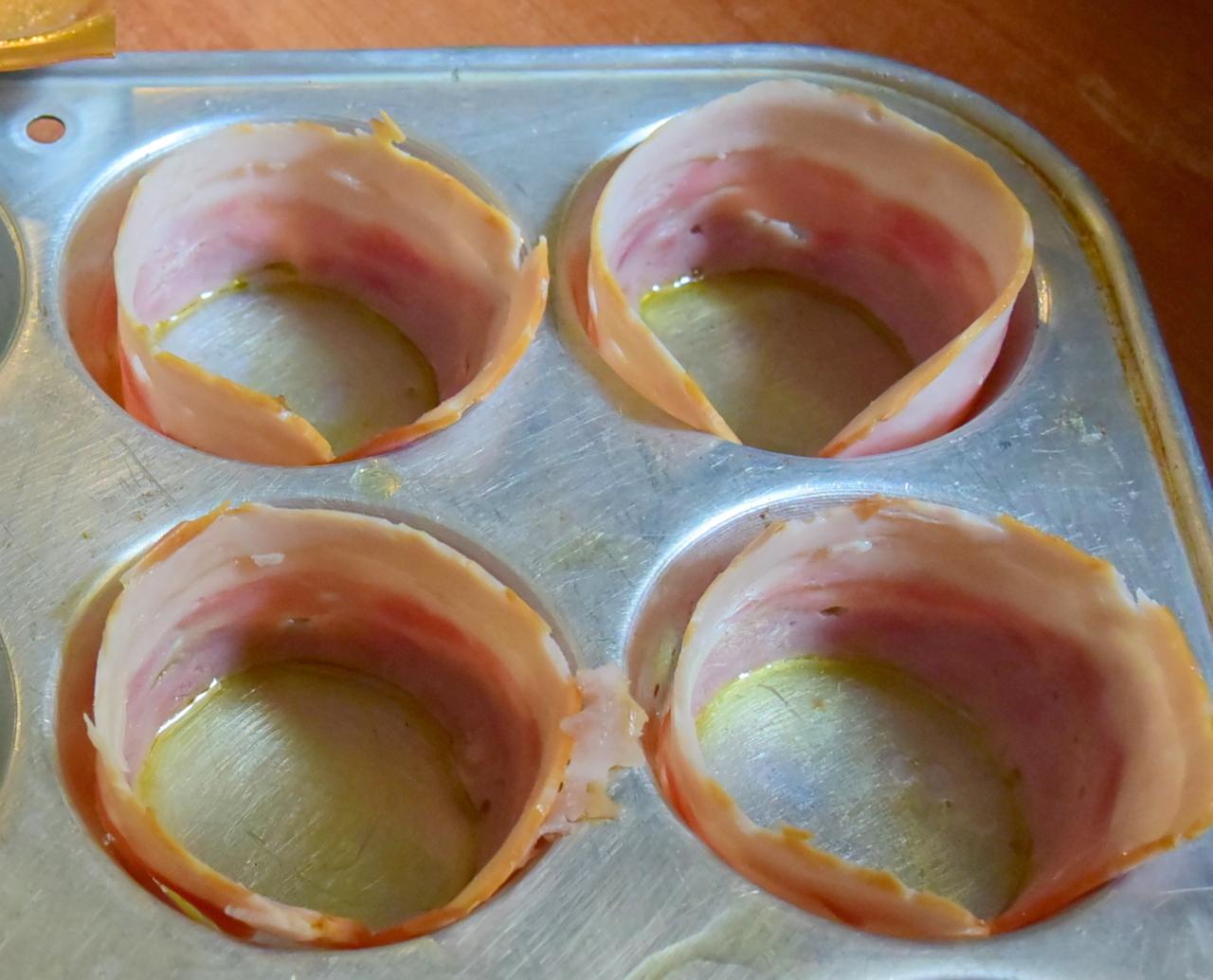 Έχουμε ταψάκι με θήκες . Λαδώνουμε καλά τις υποδοχές και βάζουμε κυκλικό το μπέικον όπως το δείχνει η φωτογραφία.
