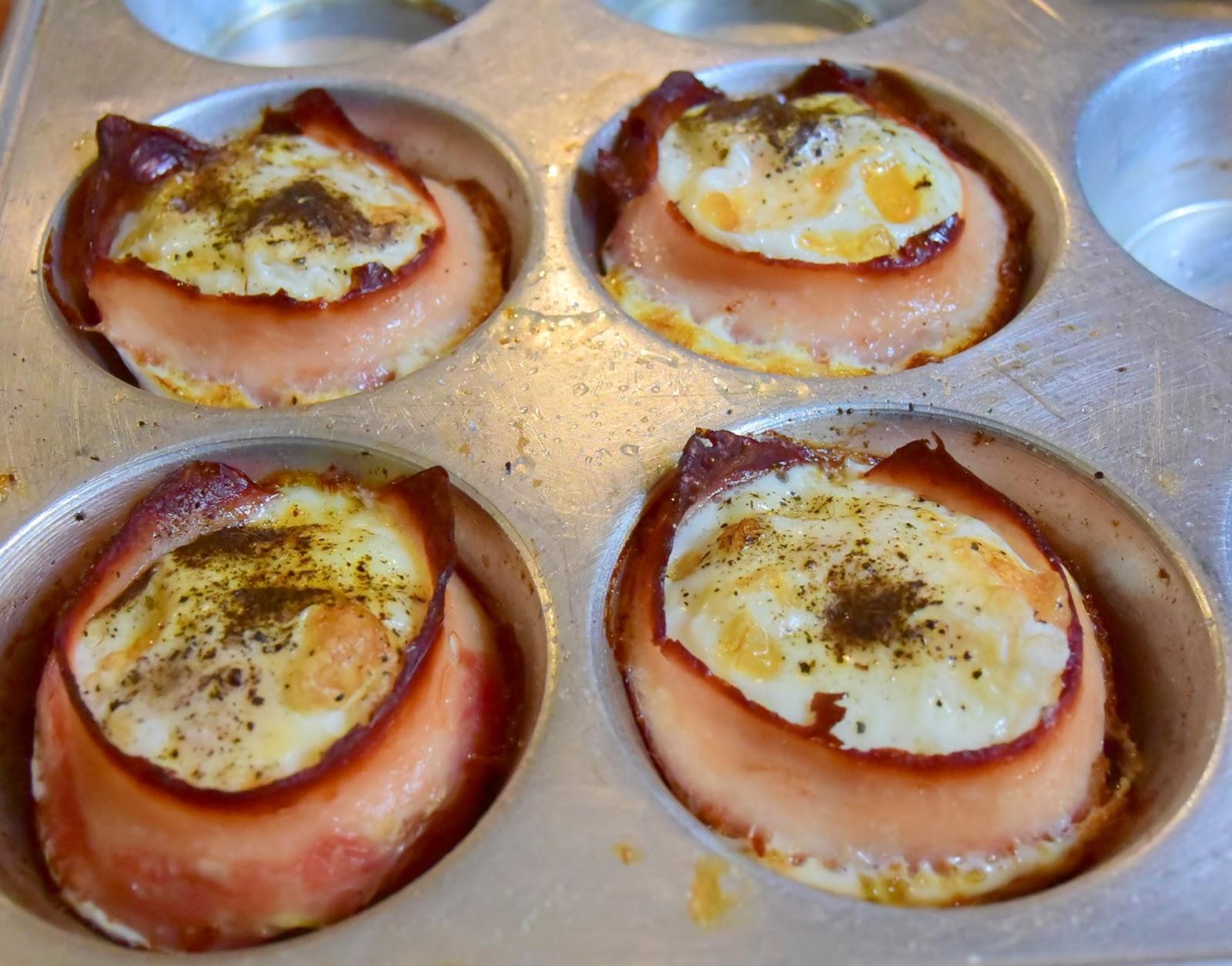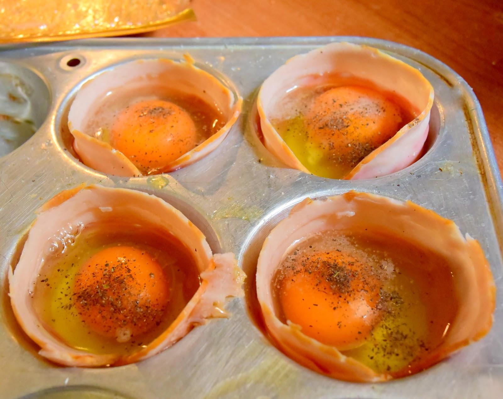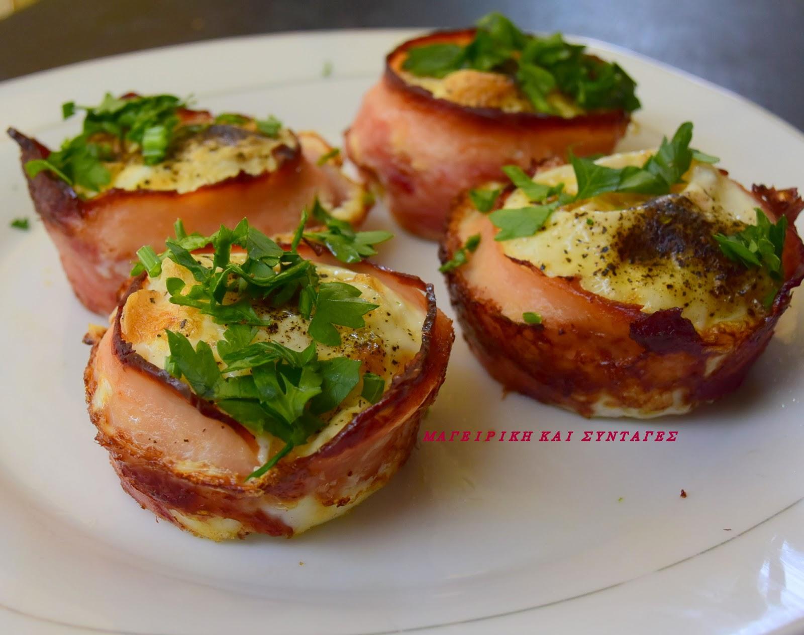 Έχουμε ταψάκι με θήκες . Λαδώνουμε καλά τις υποδοχές και βάζουμε κυκλικό το μπέικον όπως το δείχνει η φωτογραφία.