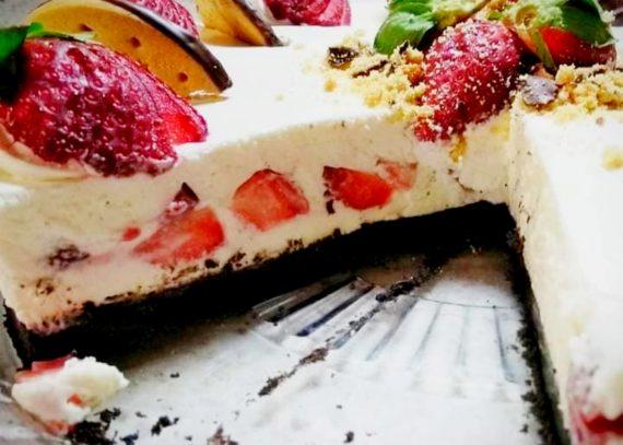 Απλώνουμε την μισή κρέμα στην βάση. Προσθέτουμε και κάνουμε στρώσεις με τις φράουλες σε κυβάκια πάνω στην κρέμα και τελειώνουμε με την υπόλοιπη κρέμα που κρατήσαμε. Βάζουμε το γλυκό μας στο ψυγείο να παγώσει καλά.