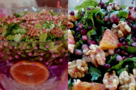 Στην αρχή πλένουμε καλά τα λαχανικά. Τα βάζουμε για λίγο στο ξύδι και αρχίζουμε βάζοντας πρώτα σε σαλατιέρα το λάχανο ψιλοκομμένο, στην συνέχεια το κόκκινο λάχανο ψιλοκομμένο, το μαρούλι, από πάνω την ρόδα και διακοσμούμε με καρύδια, φέτες πορτοκαλιού και σπόρους ροδιού.