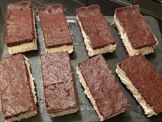 Μόλις δέσει το μείγμα για την κρέμα, Παίρνουμε έναν καθαρό χάρακα και μετράμε το πλάτος από το παντεσπάνι. Το κόβουμε ακριβώς στην μέση με ένα μαχαίρι χωρίς δόντια. Το ένα κομμάτι το βάζουμε στην άκρη. Με την βοήθεια ενός παραλληλόγραμμου τσερκιού βάζουμε το ένα παντεσπάνι και απλώνουμε ομοιόμορφα με μία μαρίζ την κρέμα για να μπορέσει πάει παντού.