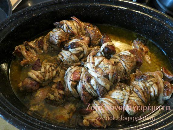Περνάμε σε ξυλάκια εν αλάξ τα γλυκάδια και τα υπόλοιπα εντόσθια και με τα εντεράκια προσπαθούμε να τα κλείσουμε… όσο γίνετε!!!