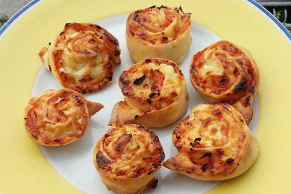 Φτιάχνουμε την ζύμη ανακατεύοντας σε μια λεκανίτσα ή μπολ το αλεύρι, την μαγιά, το αλάτι και το ξίδι. Προσθέτουμε λίγο λίγο το νερό και ζυμώνουμε μέχρι να έχουμε μια ζύμη όχι πολύ σφιχτή που να μην κολλάει στα χέρια μας (αυτό το βλέπουμε στην πράξη κι ανάλογα προσθέτουμε νερό ή αλεύρι επιπλέον). Σκεπάζουμε με μια πετσέτα κι αφήνουμε να ξεκουραστεί και να φουσκώσει για 60-90 λεπτά. Σε ένα αντικολλητικό τηγάνι σοτάρουμε σε λίγο ελαιόλαδο το ψιλοκομμένο κρεμμύδι,το μπέικον και το κοτόπουλο. Αλατοπιπερώνουμε, αφήνουμε να κρυώσουν και προσθέτουμε το τυρί ανακατεύοντας. Χωρίζουμε την ζύμη μας σε 4 μπαλάκια. Ανοίγουμε με τον πλάστη κάθε μπάλα ζύμης σε στενόμακρο στενό φύλλο. Τοποθετούμε από την γέμιση σε κάθε φύλλο και τυλίγουμε σε σφιχτό ρολό. Κόβουμε το κάθε ρολό σε μικρότερα ρολάκια πάχους 2 cm και τα τοποθετούμε στην λαμαρίνα του φούρνου (ή σε μεγάλο ταψί) στην οποία έχουμε στρώσει λαδόκολλα. Ψήνουμε στους 180 βαθμούς για περίπου 20 λεπτά (ανάλογα τον φούρνο μας)