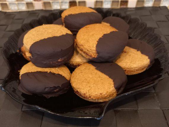 Όταν κρυώσουν βάζουμε στο ένα μπισκότο μαρμελάδα και το καπακώνουμε με το άλλο. Βουτάμε το μισό μπισκότο στην λιωμένη κουβερτούρα και τα αφήνουμε στην λαδόκολλα να στεγνώσουν.