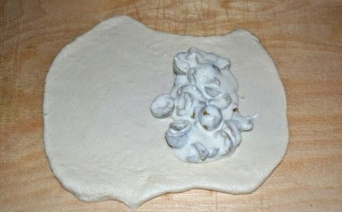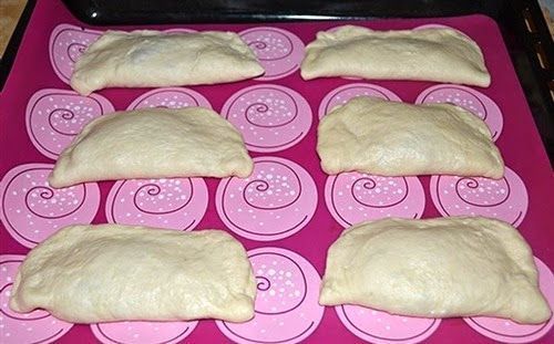 Ανοίγουμε κάθε μπάλα σε ένα ορθογώνιο και τοποθετήστε στη μία πλευρά μια κουταλιά της σούπας από τη σάλτσα.