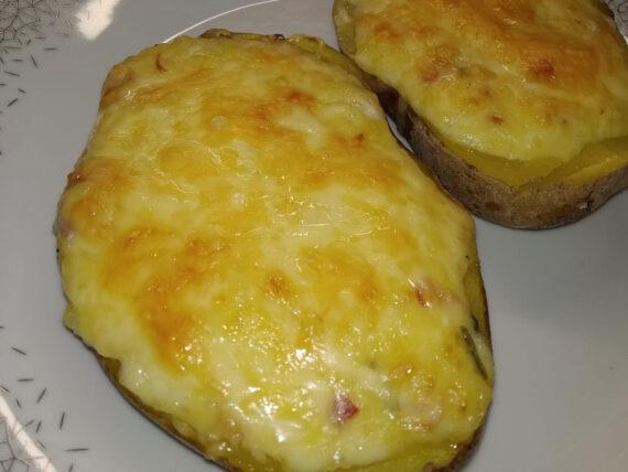 Επίσης προσθέτουμε το κεφαλοτύρι, το βούτυρο και το μπέικον κομμένο σε κομμάτια. Την ψίχα της πατάτας την κάνουμε πουρέ. Γεμίζουμε την γέμιση και τον πουρέ τις πατάτες και τις πασπαλίζουμε από πάνω με τριμμένο γκούντα. Ψήνουμε στους 200 βαθμούς Κελσίου, μέχρι να πάρουν ωραίο χρώμα.