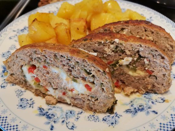 Ρολό κιμά γεμιστό με αυγό μπέικον και διάφορα τυριά