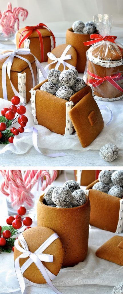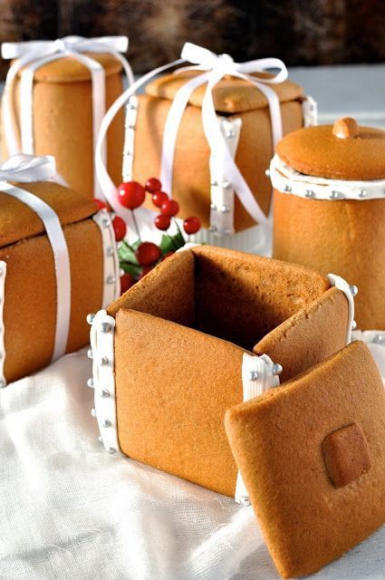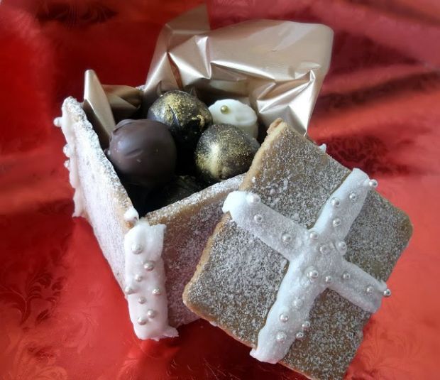 Για τα πιο νόστιμα κουτιά κόψτε τη ζύμη σε μεγάλα ισομεγέθη τετράγωνα. Ψήστε τα, αφήστε τα να στεγνώσουν και στολίστε τα όπως θέλετε. Κρατήστε μερικά χωρίς στόλισμα για να κάνετε τη βάση του κουτιού. Βάλτε στην επιφάνεια εργασίας ένα σκέτο μπισκότο και με ένα λεπτό κορνέ απλώστε γύρω-γύρω λίγη λιωμένη σοκολάτα ή γλάσο. Πάνω εκεί θα στερεώσετε (και θα κρατήσετε για λίγο μέχρι να σταθεροποιηθούν) τα τέσσερα στολισμένα μπισκότα που θα αποτελέσουν τις πλευρές. Με το κορνέ ενισχύστε λίγο ακόμη τις ενώσεις εσωτερικά με σοκολάτα ή γλάσο. Το κουτί είναι έτοιμο για να δεχτεί μικρά σοκολατάκια ή καραμέλες.
