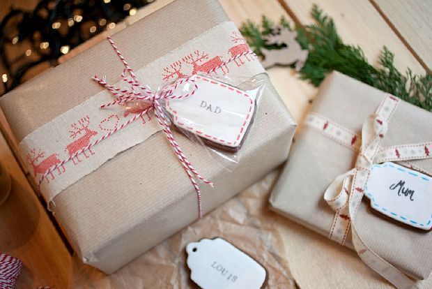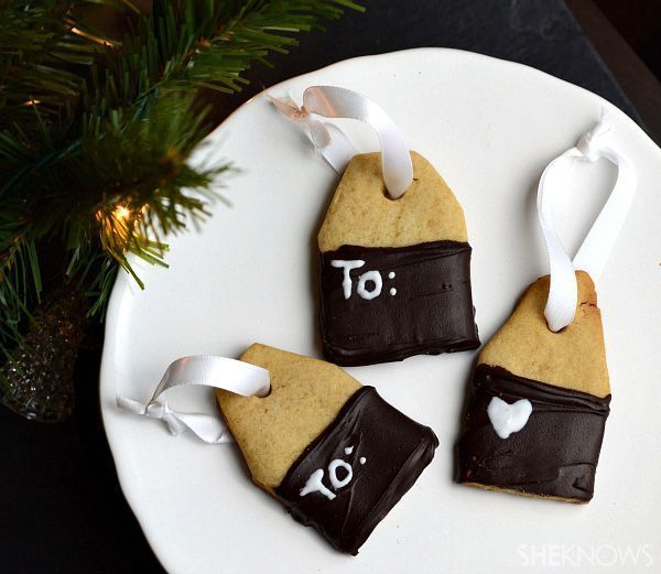 Κόψτε μακρόστενα κομμάτια ζύμης για να κάνετε ταμπελάκια που θα δέσετε στις κορδέλες των δώρων που θα προσφέρετε. Με ένα χοντρό καλαμάκι, από αυτά που πίνουμε τα κοκτέιλ, θα κάνετε μια τρύπα στη μέση της μιας πλευράς πριν τα ψήσετε, για να περάσει μετά η κορδέλα. Όταν ψηθούν και κρυώσουν, θα τα χρωματίσετε με όποιο χρώμα θέλετε και με ένα πολύ λεπτό κορνέ και μαύρη σοκολάτα λιωμένη, ή γλάσο σε άλλο χρώμα, θα γράψετε το όνομα εκείνου που θα παραλάβει το δώρο. Όταν στεγνώσουν, θα τα τυλίξετε σε ζελατίνα και με μια λεπτή κορδέλα θα τα δέσετε πάνω στο δώρο.
