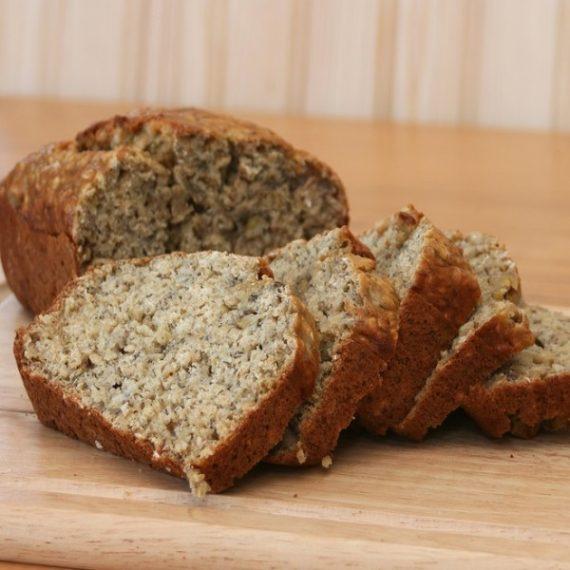 Αναμιγνύετε τα αλεσμένα καρύδια με το λιναρόσπορο και τη βρώμη. Πολτοποιείτε στο μπλέντερ τα φρούτα. Χτυπάτε τα ασπράδια τους κρόκους, τη βανίλια και την κανέλα και αναμιγνύειετε όλα τα υλικά προσθέτοντας το μπέικιν πάουντερ. Βάλτε το μείγμα σε φόρμα σιλικόνης ή σε φόρμα καλυμμένη με αντικολλητικό χαρτί φούρνου και ψήστε στους 200 βαθμούς για περίπου 50 λεπτά. Προτού κρυώσει, το περιχύνετε με το μέλι.