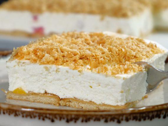 150 g milk 150 g tea biscuits ———————————- 500 g vegetable whipping cream(cold) 150 g sugar 200 g yoghurt 300 g fruits, canned syrup 2 vanilla ———————————– 130 g puff pastry sugar topped ——————————— 26×26 cm