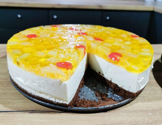Μόλις περάσουν 4 ώρες περίπου και έχει σφίξει η κρέμα διαλύουμε σε 200 γρ ζεστού νερού 1 φακελο με φρουί ζελε με γεύση ανανά. Μόλις διαλυθεί καλά προσθέτουμε ακόμη 200 γρ κρύο νερό και ανακατεύουμε καλά.