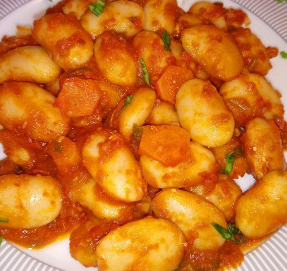 500γρ γίγαντες Καστοριάς/Πρεσπών 2 κρεμμύδια ψιλοκομμένα (στο χέρι) 1 καρότο ψιλοκομμένο 3 φρέσκες ντομάτες τριμμένες 1 κούπα ελαιόλαδο (250 ml) 1 κ.γλ. κοφτό αλάτι (δοκιμάζεις ανάλογα) ½ κ.γλ. ζάχαρη μαυροπίπερο 2 σκελίδες σκόρδο 2 κούπες από το νερό που έβρασαν οι γίγαντες (έχεις και λίγο ακόμη εξτρά αν χρειαστεί) μαιντανό