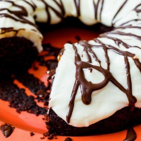 Χύστε το μείγμα σας στη φόρμα του κέικ και ψήστε για περίπου 30 λεπτά σε προθερμασμένο φούρνο. Για την επικάλυψη Στο μίξερ, χτυπήστε το βούτυρο, την κρέμα τυριού. Βαθμιαία προσθέστε τη ζάχαρη άχνη και ανακατέψτε. Προσθέστε τη βανίλια και το γάλα, 1 κουταλιά της σούπας κάθε φορά και ανακατέψτε. Προσθέστε λίγη περισσότερη ζάχαρη ή γάλα εάν είναι απαραίτητο για να γίνει η επικάλυψη σας πιο αφράτη. Αναποδογυρίστε το κέικ σε μια πιατέλα και απλώστε πάνω την επικάλυψη. Εάν το επιθυμείτε ρίξτε από πάνω και σιρόπι σοκολάτας. Καλή σας απόλαυση!