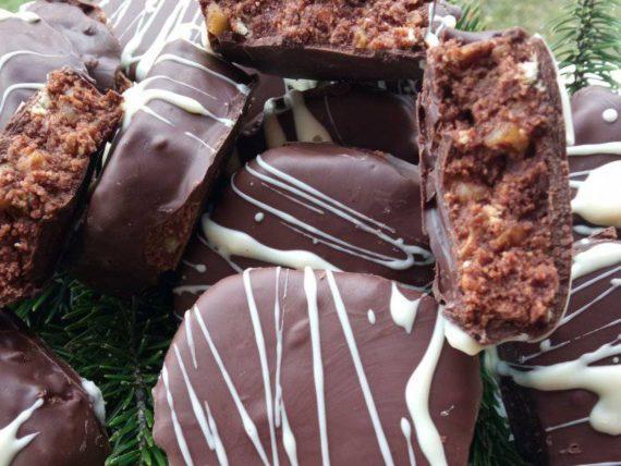 Γιορτινές καριόκες από την Τζένη Τσανακτσίδου. Καριόκες με μπισκότα πτι μπερ και καρύδια και επικάλυψη από μαύρη και λευκή σοκολάτα.