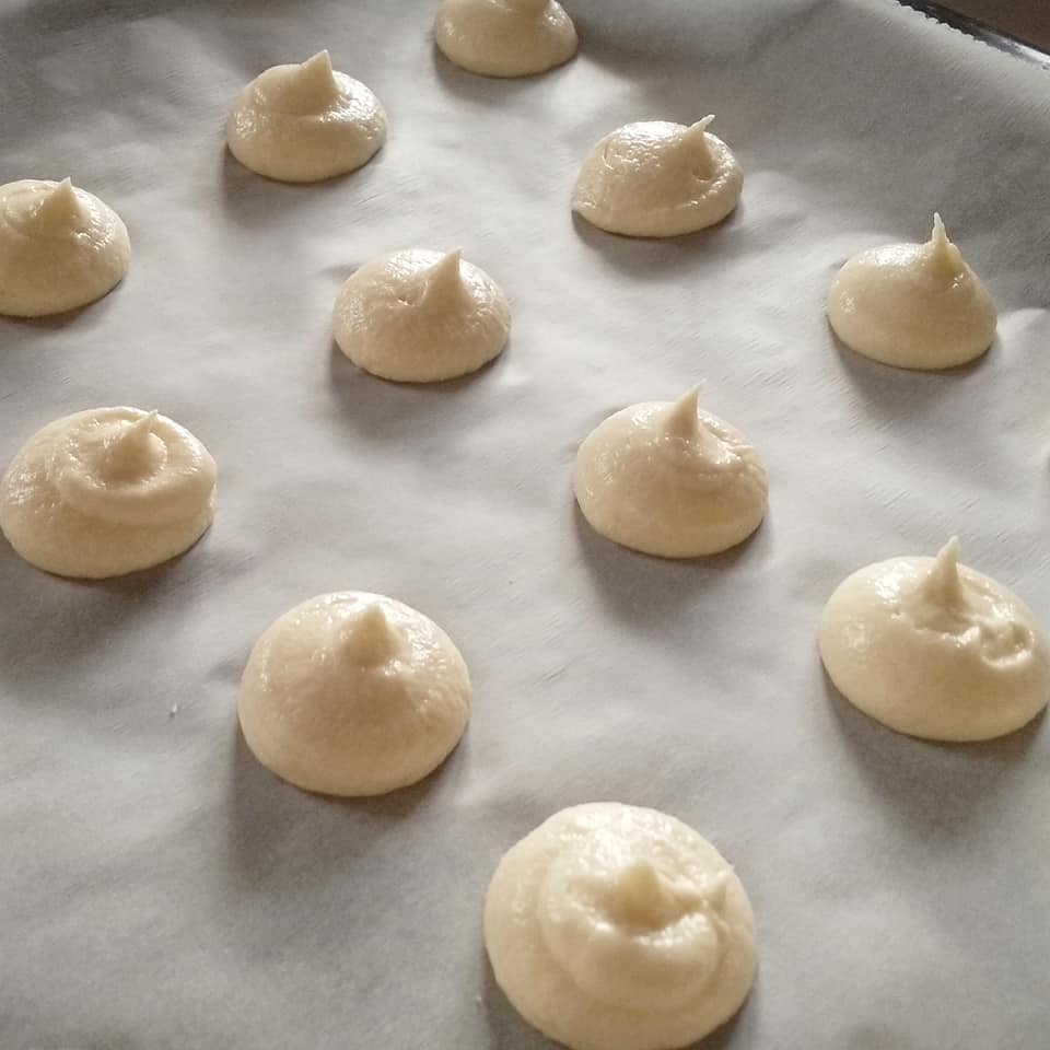 Τέλος προσθέτω σταδιακά και τα ασπράδια και ανακατεύω καλά να ομογενοποιηθούν. Η ζύμη μας πρέπει να είναι μαλάκια πολύ και να περνάει μέσα από το κορνε. Στρώνουμε λαδόκολλα στα ταψάκια μας και προθερμαίνουμε τον φούρνο μας στους 180 βαθμούς στο αερόθερμο.