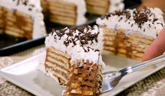 Ingredients 500 g tea biscuits 500 g cream cheese 400 g cocoa spread with hazelnuts(sisinni) 200 g milk ————————————————– 500 g vegetable whipping cream(cold) 80 g sugar —————————————————- Chocolate flakes