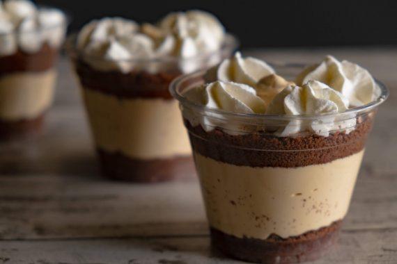 Αφού γίνει σαντιγί προσθέτουμε το καραμελωμένο ζαχαρούχο και χτυπάμε ξανά να ενσωματωθούν καλά. Παίρνουμε τα ποτηράκια και ξεκινάμε βάζοντας μπισκότο στον πάτο μαζί με 2 κτσ γάλα. Με το κορνέ βάζουμε προσεκτικά την κρέμα καραμέλας που φτιάξαμε.