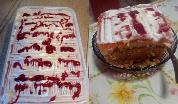 Αφού το ζελέ κρυώσει καλά και σταθεροποιηθεί ρίχνουμε από πάνω λίγη έτοιμη σαντιγί από το σούπερ μαρκέτ και λίγο σιρόπι φράουλας.