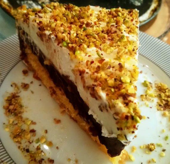 Χτυπάμε μία σαντιγί γκαρνί στο μίξερ σύμφωνα με τις οδηγίες παρασκευής και αφού έχει κρυώσει το γλυκό μας, βάζουμε την σαντιγί από πάνω. Γαρνίρουμε με τριμμένο φιστίκι.