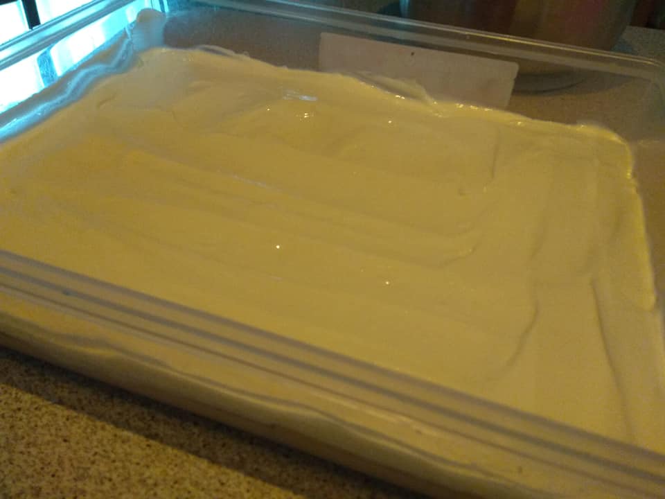 Στο τάπερ που φτιάχνουμε τα γλυκά ψυγείου ή σε μακρόστενο ταψάκι μιας χρήσης, απλώνουμε τις βάφλες.