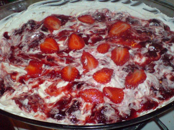 900 γρ. φράουλες σε φέτες 3 1/2 φλ. τσαγιού κρέμα γάλακτος 1/3 φλ. τσαγιού ζάχαρη άχνη 1 κ.γ. βανίλια σκόνη 28 μπισκότα τύπου πτι μπερ μαρμελάδα φράουλας
