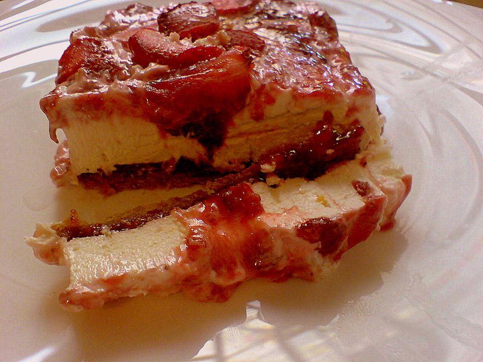 Χτυπήστε τα 3 φλ. κρέμας γάλακτος στο μίξερ μέχρι να έχετε μια πηχτή σαντιγί που να στέκεται. Προσθέτετε τη ζάχαρη άχνη και τη βανίλια και συνεχίζετε το χτύπημα για 2′ μέχρι να ενσωματωθούν. Στρώνετε μια μικρή ποσότητα του μείγματος σαντιγί σε ένα πυρέξ 20 X 30 εκ. περίπου και απλώνετε από πάνω μια στρώση μπισκότα.Στρώνετε μαρμελάδα λεπτή στρώση Βάζετε ακόμα μια μικρή στρώση σαντιγί και μετά μια στρώση από τις κομμένες σε φέτες φράουλες. Επαναλαμβάνετε την ίδια διαδικασία μέχρι να έχετε 3 η 4 στρώματα μπισκότων. Χτυπάτε το υπόλοιπο 1/2 φλ. τσαγιού κρέμα γάλακτος σε σαντιγί σταματάμε το χτύπημα προσθέτουμε λίγη 3-κουταλιές σούπας μαρμελάδα ανακατεύουμε ελαφρως το στρώνουμε ομοιόμορφα και βάζουμε λίγες κομμένες φράουλες διάσπαρτες Το βάζετε στο ψυγείο για 2 ώρες να μαλακώσουν τα μπισκότα. Από ΜΑΓΕΙΡΙΚΗ ΚΑΙ ΣΥΝΤΑΓΕΣ Μπορούμε να αντικαταστήσουμε τις φράουλες με κεράσι μαρμελάδα και φρέσκα κερασια