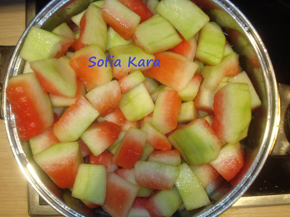 Υλικα 2 κιλα καθαρισμένο καρπούζι το ασπρο και λιγο απο το κοκκινο 2 κιλα ζαχαρη 2 βανιλιες Χυμο από 1 λεμονι 6 λεμονια ζουμερα