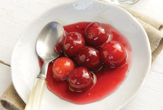 Εκτέλεση Διαλέγουμε κεράσια σφιχτά και τραγανά, χωρίς χτυπήματα. Χρησιμοποιούμε γάντια στο καθάρισμα γιατί βάφουν το δέρμα. Διαλύουμε τον ασβέστη σε 2 λίτρα νερό μέχρι να ασπρίσει καλά το νερό. Τοποθετούμε μέσα τα κεράσια και τα αφήνουμε για 2 ώρες. Αυτή η διαδικασία θα βοηθήσει ώστε τα κεράσια να γίνουν τραγανά. Αν δεν βρείτε ασβέστη βάλτε τα κεράσια σε μπολ με νερό και 2-3 λεμόνια κομμένα και στυμμένα (και τις λεμονόκουπες). Αφού περάσουν οι 2 ώρες ξεπλένουμε πολύ καλά τα φρούτα με μπόλικο νερό. Αφαιρούμε το κοτσάνι και τα κουκούτσια πάνω από μια κατσαρόλα ώστε να συλλέξουμε τους χυμούς τους. Είναι προτιμότερο να βγάλουμε τα κουκούτσια με την ανάποδη της φουρκέτας για να μη λιώσουν. Ξεπλένουμε τα κουκούτσια με το 1/2 φλ. τσαγιού νερό και φυλάμε το νερό για να το χρησιμοποιήσουμε στο γλυκό. Σε μια κατσαρόλα με χοντρή βάση τοποθετούμε εναλλάξ κεράσια και ζάχαρη σε στρώσεις. Αφήνουμε μία νύχτα στο ψυγείο για να κατεβάσουν τα κεράσια τους χυμούς τους.