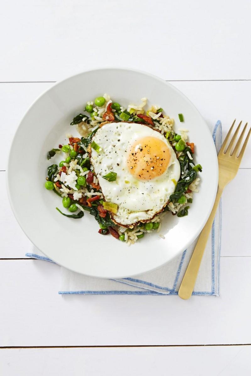 3. Ρύζι με λαχανικά, μπέικον και αυγό- Βράζεις ρύζι που γίνεται μέσα σε 10 λεπτά και την ίδια ώρα βράζεις σε άλλο κατσαρολάκι μερικά λαχανικά, όπως αρακά, λίγο σπανάκι κλπ. Σουρώνεις, ανακατεύεις με το ρύζι μόλις ετοιμαστεί και τηγανίζεις λίγο μπέικον και μετά στο ίδιο τηγάνι που θα έχει βγει το λίπος ένα αυγό μάτι. Πραγματικά δεν χρειάζεσαι πάνω από 15 λεπτά γι αυτό το γεύμα! Επίσης να ξέρεις πως υπάρχουν και ρύζια που έχουν μέσα λαχανικά, αν δεν θέλεις να χρησιμοποιήσεις πολλά σκεύη.
