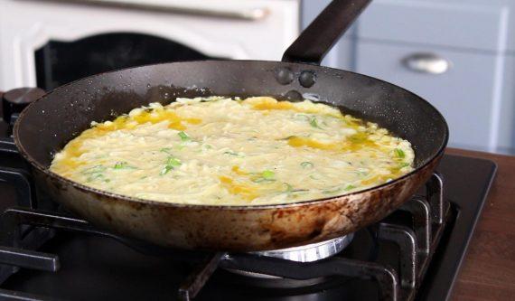 Αφού μαραθεί προσθέτουμε το μείγμα της ομελέτας και ανακατεύουμε για λίγο. Στο τέλος σκεπάζουμε το γεύμα και ψήνουμε την ομελέτα για 4-5 λεπτά. Απολαμβάνουμε.