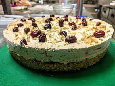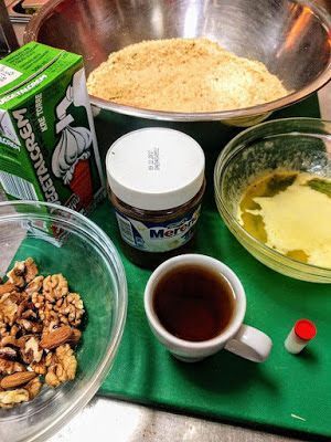 1 Φυτική σαντιγί, 1 Μερέντα, 2 πακέτα μπισκότα 120 γραμ βούτυρο , 1 φλιτζανάκι ελληνικού κονιάκ 1 βανίλια, ξηρούς καρπούς ότι έχουμε