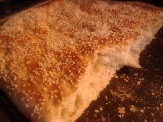 Όταν την απλώσουμε, με το χέρι μας την βρέχουμε με λίγο νερό και την πασπαλίζουμε με μπόλικο σουσάμι. Σκεπάζουμε ξανά την λαγάνα, με μια καθαρή πετσέτα και την αφήνουμε σε ζεστό μέρος, για 20′ – 30′, να φουσκώσει πάλι.
